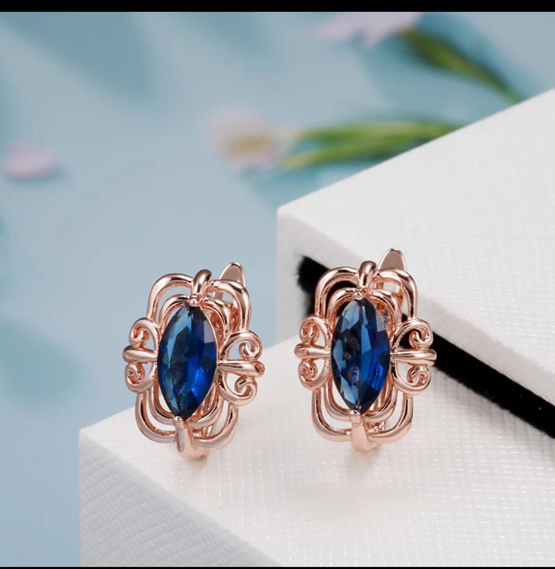 Pendiente de oro rosa 585 para mujer con rombo de circón azul natural con flores de estilo étnico vintage.