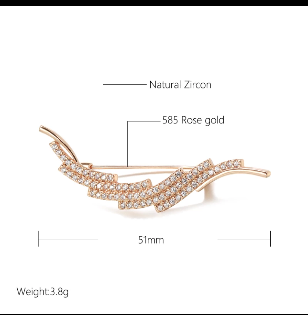 Fino broche de oro rosa 585 (grabado en su interior) para mujer, en forma de arco con incrustaciones de circónes naturales. Tendencia 2022.
