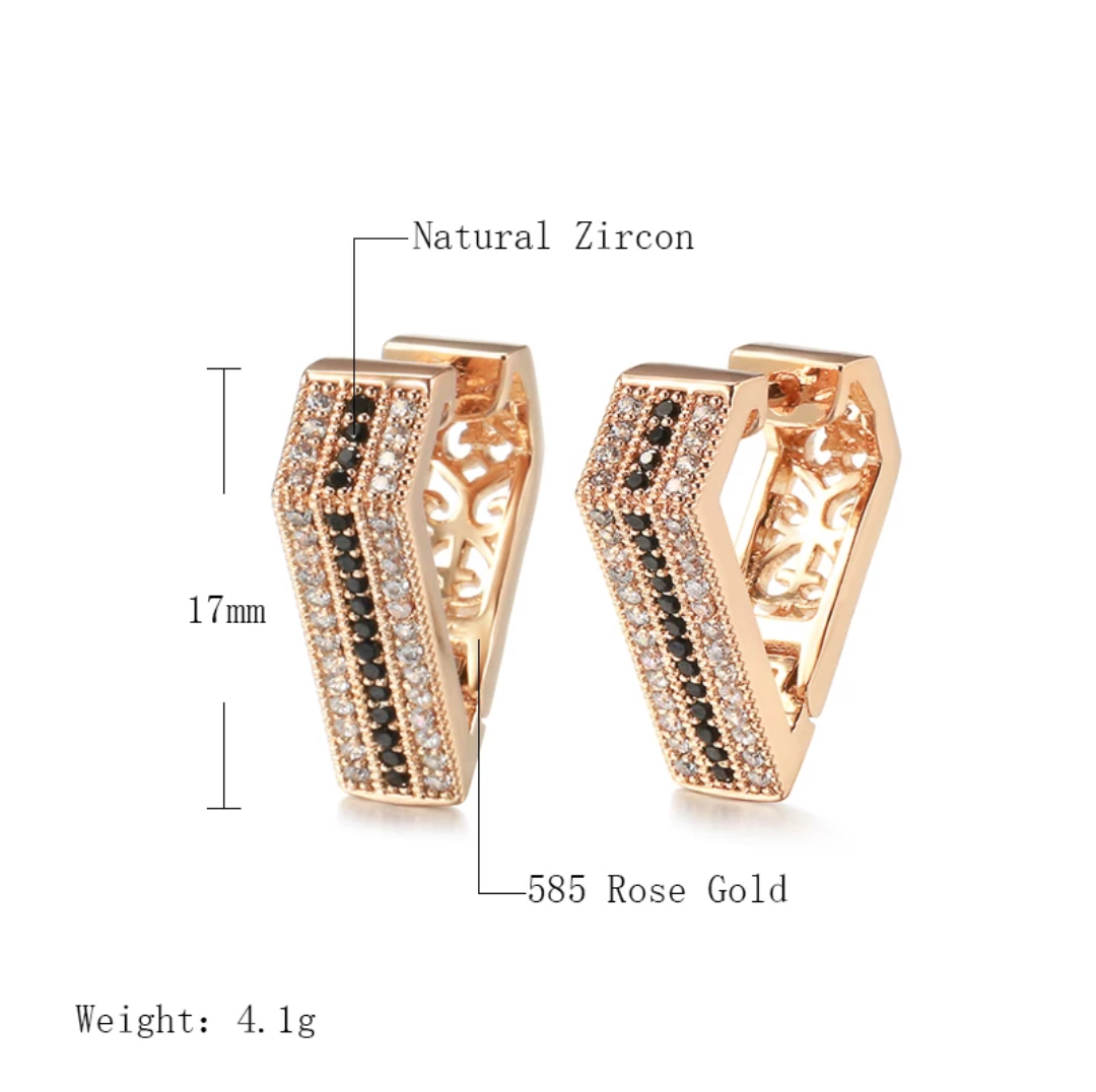 Pendientes únicos de oro rosa 585 (grabado en su interior) con incrustaciones de circonita negra natural. Joyería exótica con exquisitos acabados.