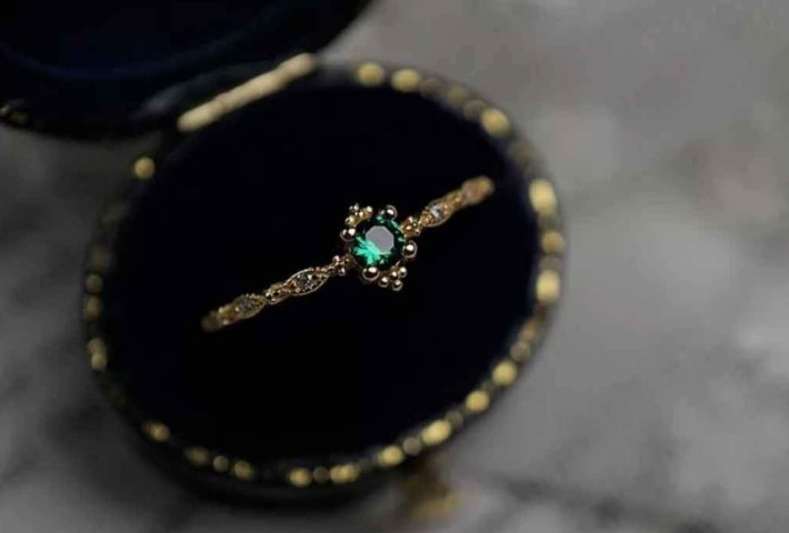Anillo de plata de primera ley, bañado en oro amarillo con circonia de color verde esmeralda para mujer.sortija ajustable.Tamaño adaptable para tallas 6,7,8
