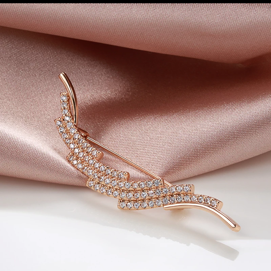Fino broche de oro rosa 585 (grabado en su interior) para mujer, en forma de arco con incrustaciones de circónes naturales. Tendencia 2022.